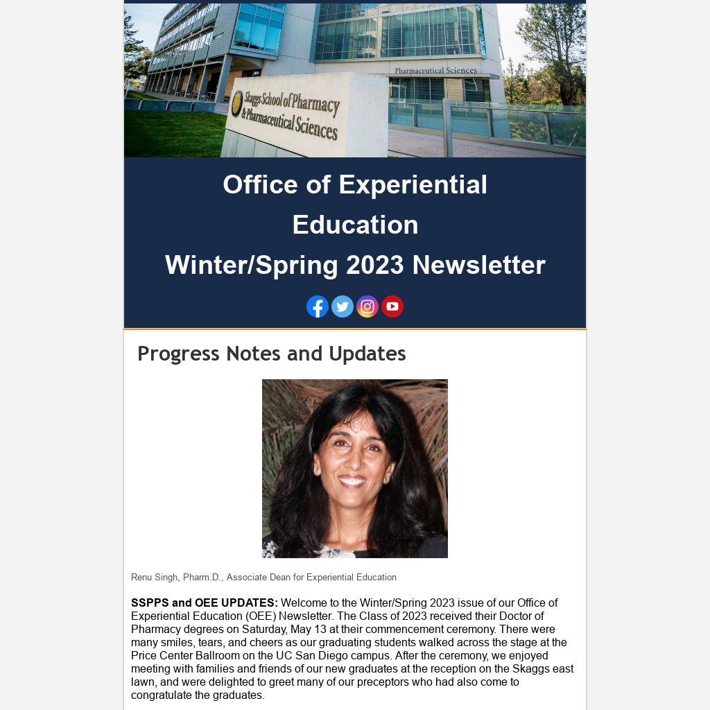 SSPPS and OEE UPDATES: Welcome to the Winter/Spring 2023 issue of our Office of Experiential Education (OEE) Newsletter. The Class of 2023 received their Doctor of Pharmacy degrees on Saturday, May 13 at their commencement ceremony. There were many smiles, tears, and cheers as our graduating students walked across the stage at the Price Center Ballroom on the UC San Diego campus. After the ceremony, we enjoyed meeting with families and friends of our new graduates at the reception on the Skaggs east lawn, and were delighted to greet many of our preceptors who had also come to congratulate the graduates.